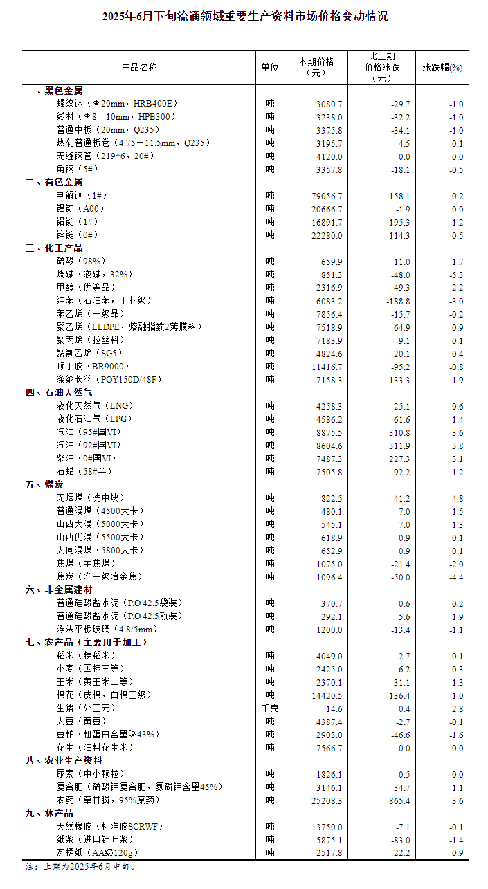 2025年6月下旬流通领域重要生产资料市场价格变动情况